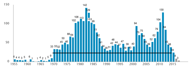 The Brazilian oil and gas industry faces a drastic reduction in its activity. Among several indicators of this, one to be highlighted is the reduction in the number of wells drilled per year. Drilling is the activity the paves the following activities in this industry and, therefore, its reduction implies reduction to the whole sector. A study performed by ABESPetro and Accenture, based on data from the Brazilian Agency of Petroleum (ANP), indicates that the number of wells drilled in 2015 and 2016 can only be compared with data from 1969. The figure below shows the evolution of this indicator.