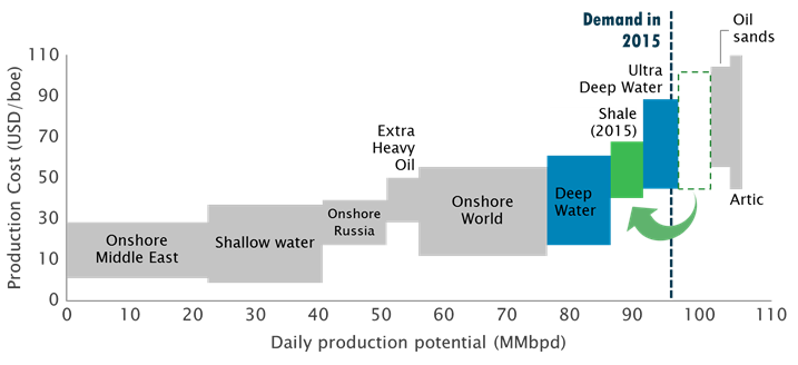 The figure indicates that additional demand of oil will be preferably supplied by shale oil rather than oil from UDW. In other words, the shale oil development may imply, in the limit, that the Brazilian pre-salt will not see its potential turned into real economic benefits.